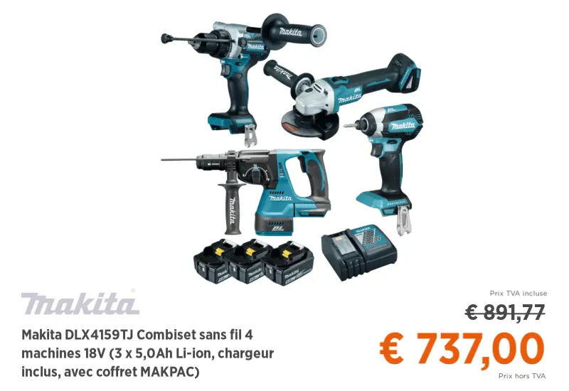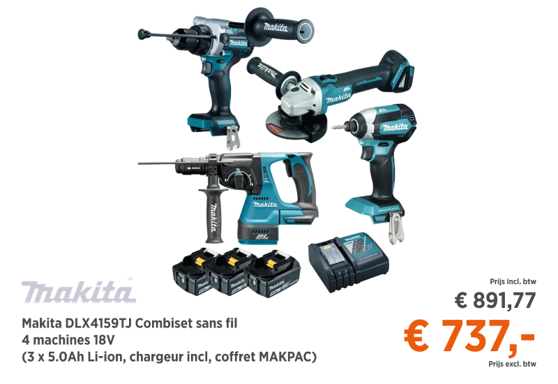 Découvrez la Makita DLX4159TJ pendant la Black Week sur Lecot.shop. Ce set combiné puissant de 4 outils fonctionne entièrement sur la plateforme 18V LXT et réunit une meuleuse d’angle, une perceuse à percussion, un marteau perforateur et une visseuse à chocs. Avec trois batteries 5,0 Ah, un chargeur rapide et des coffrets empilables PAKPAC, vous êtes prêt pour chaque chantier.