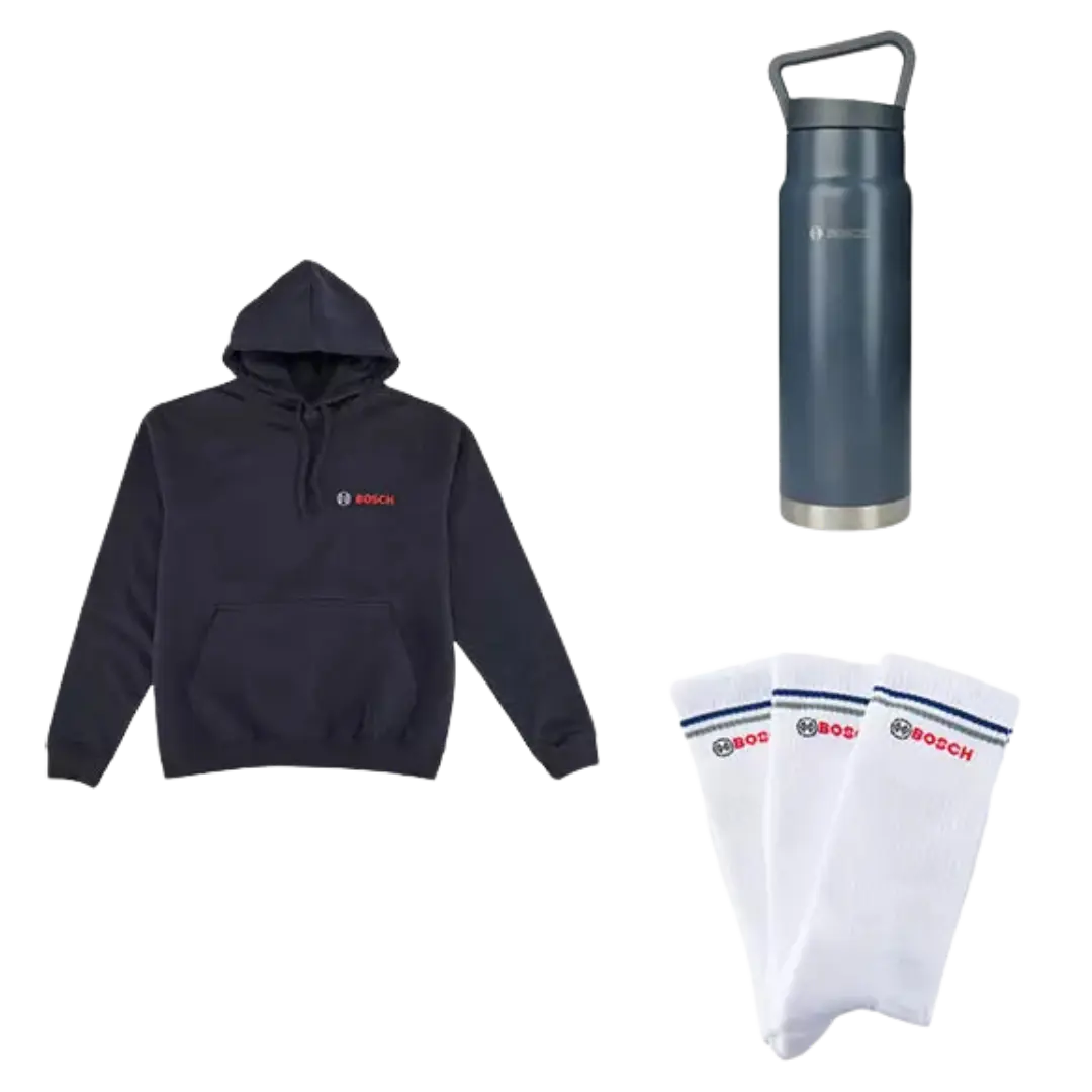 Gourde inox Bosch, chaussettes de sport Bosch (lot de 3) ou hoodie Bosch