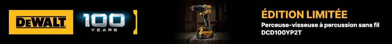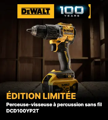 Célébrez le centenaire de DeWALT avec cette édition spéciale de perceuse. Le modèle DCD100YP2T-QW est un véritable hommage à un siècle de savoir-faire et d'innovation. Dépêchez-vous, car cette édition limitée de la perceuse à percussion est disponible uniquement jusqu'à épuisement des stocks.