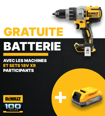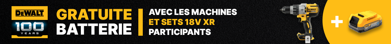 - Achetez un produit DeWALT sélectionné fonctionnant avec une batterie 18V XR sur Lecot.shop entre le 1er février 2024 et le 12 mai 2024 et recevez de DeWALT une batterie Powerstack 5Ah gratuite. L'inscription à l'action chez DeWALT doit être complétée au plus tard le 31 mai 2024.