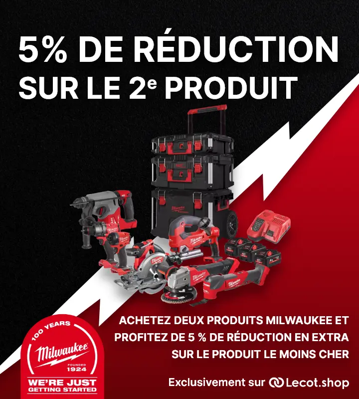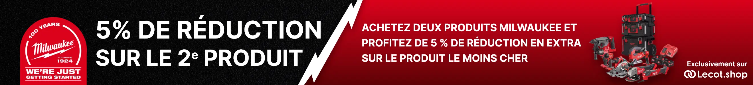 - La remise de 5 % est accordée sur le produit Milwaukee le moins cher de votre commande. Cette remise ne s'applique pas à l'ensemble de l'achat.