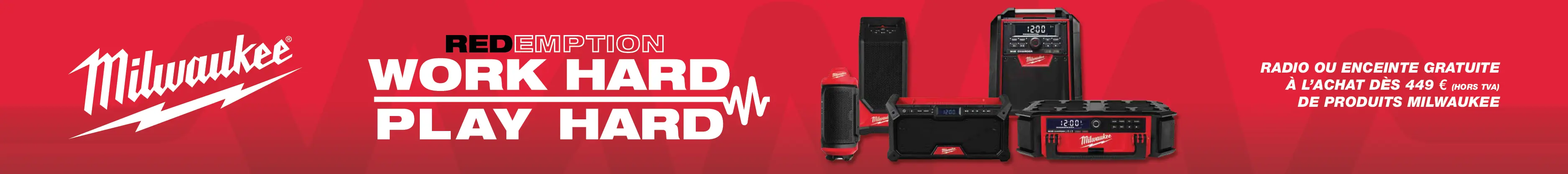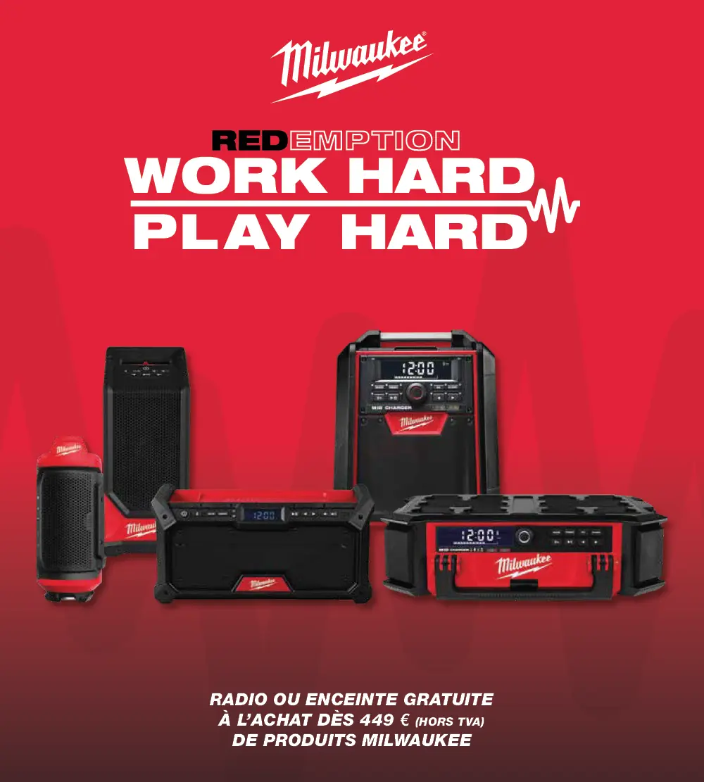 Donner le meilleur de vous-même chaque jour sur le chantier ou à l’atelier ? Une récompense s’impose. Avec la campagne MILWAUKEE® Work Hard Play Hard, vos efforts sont récompensés. De mars à mai, recevez une radio ou une enceinte de chantier gratuite à l’achat de produits MILWAUKEE®. Plus votre montant d’achat est élevé, plus le cadeau est performant.