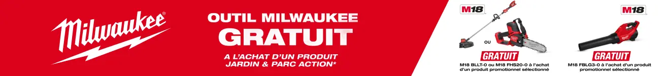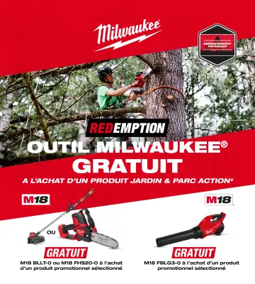 - Achetez entre le 1ᵉʳ octobre et le 31 octobre 2025 l’un des outils Milwaukee sélectionnés et recevez une débroussailleuse ou une scie d’élagage gratuite.