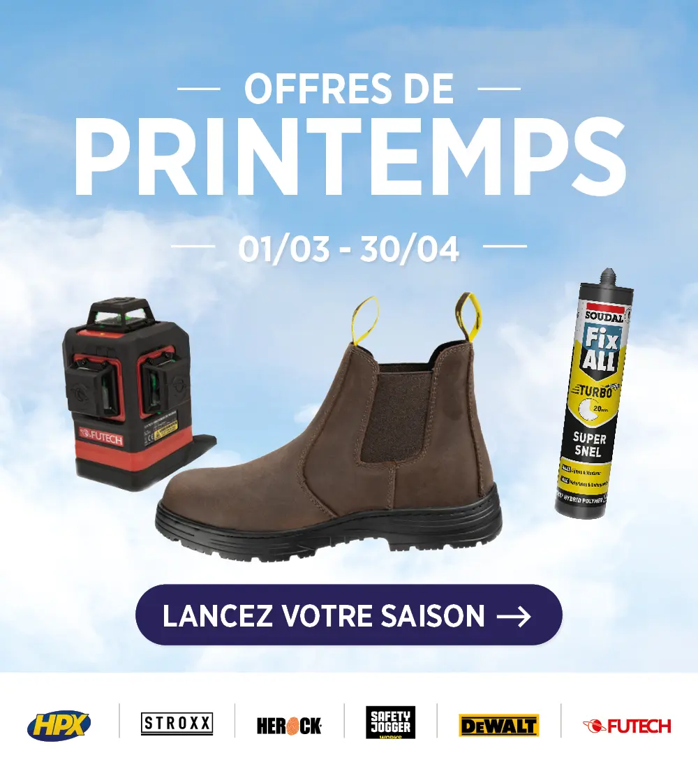 Les journées rallongent, il fait plus clair plus tôt, les températures deviennent enfin plus douces… et est-ce une impression ou tout le monde est soudain de meilleure humeur ? Le printemps ne se fait pas seulement sentir dans votre jardin. Dans le secteur de la construction aussi, la saison redémarre. C’est le moment de remettre votre atelier en ordre et de compléter votre stock ainsi que votre parc machines. Et votre tenue mérite sans doute aussi un petit upgrade après un hiver froid et humide. Lecot vous donne le coup de pouce nécessaire pour tirer le maximum de ce printemps.