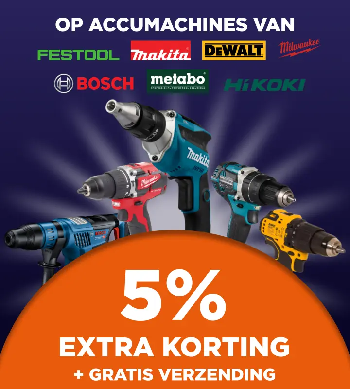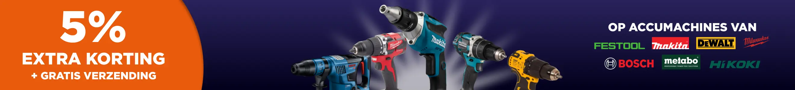 - De extra 5% korting is enkel van toepassing op de geselecteerde accumachines in je bestelling en niet op de volledige aankoop.