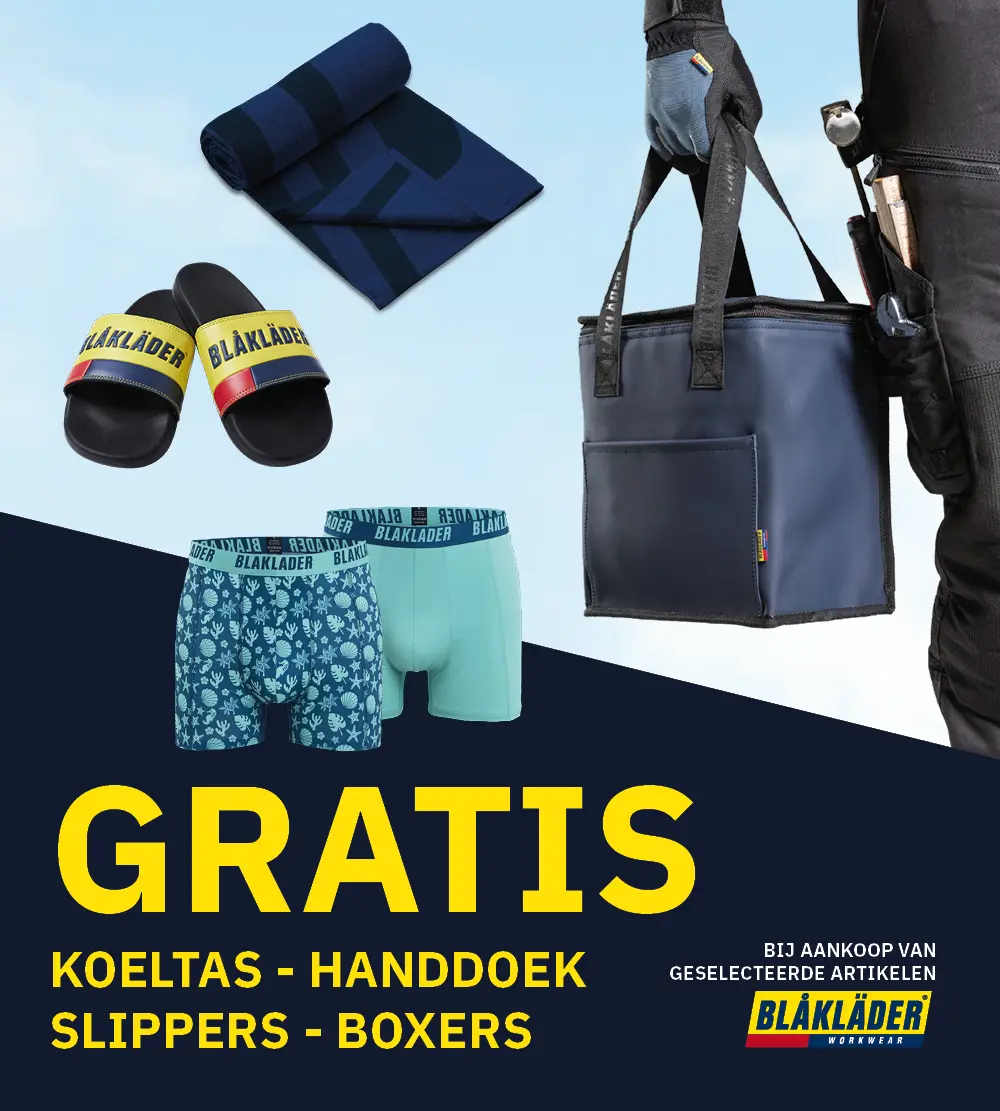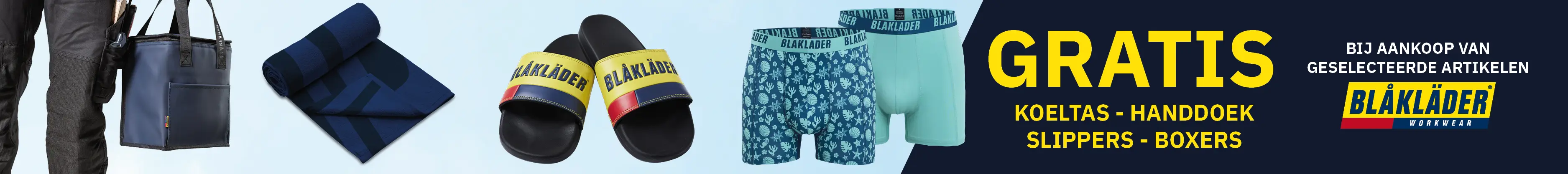 Blåkläder biedt niet alleen topkwaliteit werkkleding, maar ook geweldige gadgets! Bij aankoop van geselecteerde shorts, werkbroeken of softshells ontvang je gratis een exclusief cadeau. Kies uit een handdoek, slippers, koeltas of onderbroeken — Blåkläder zorgt ervoor dat jij er helemaal klaar voor bent, ongeacht de gelegenheid.