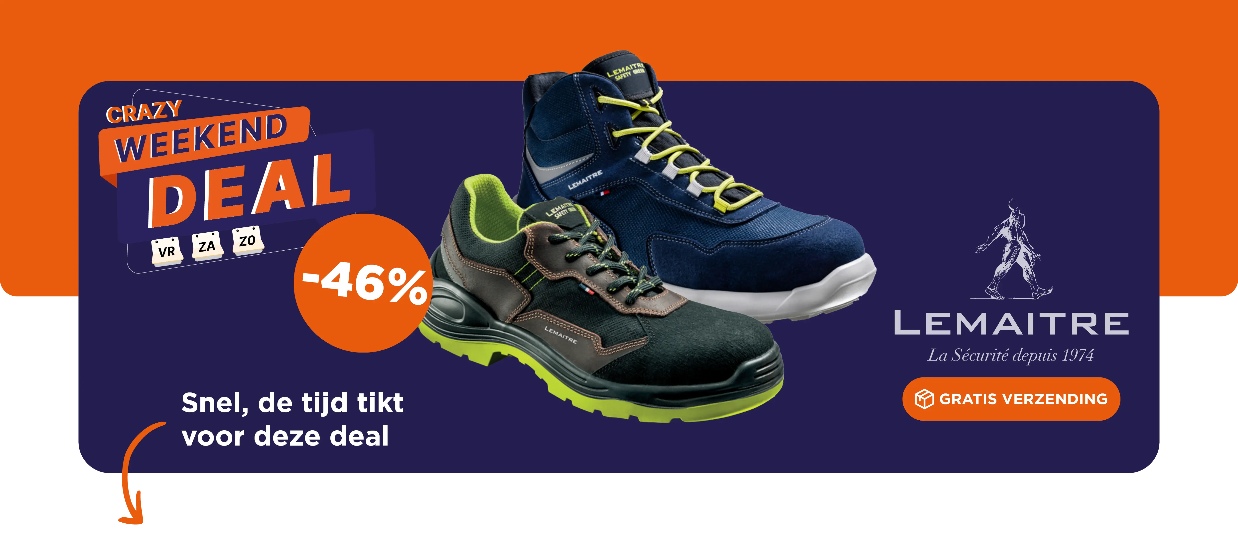 Twee paar veiligheidsschoenen. Eén doel: maximaal comfort en topprestaties op de werkvloer. Met Lemaître kies je voor innovatie, draagcomfort en robuuste bescherming in elke situatie. Grijp dit weekend je voordeel en stap veilig én in stijl de werf op!