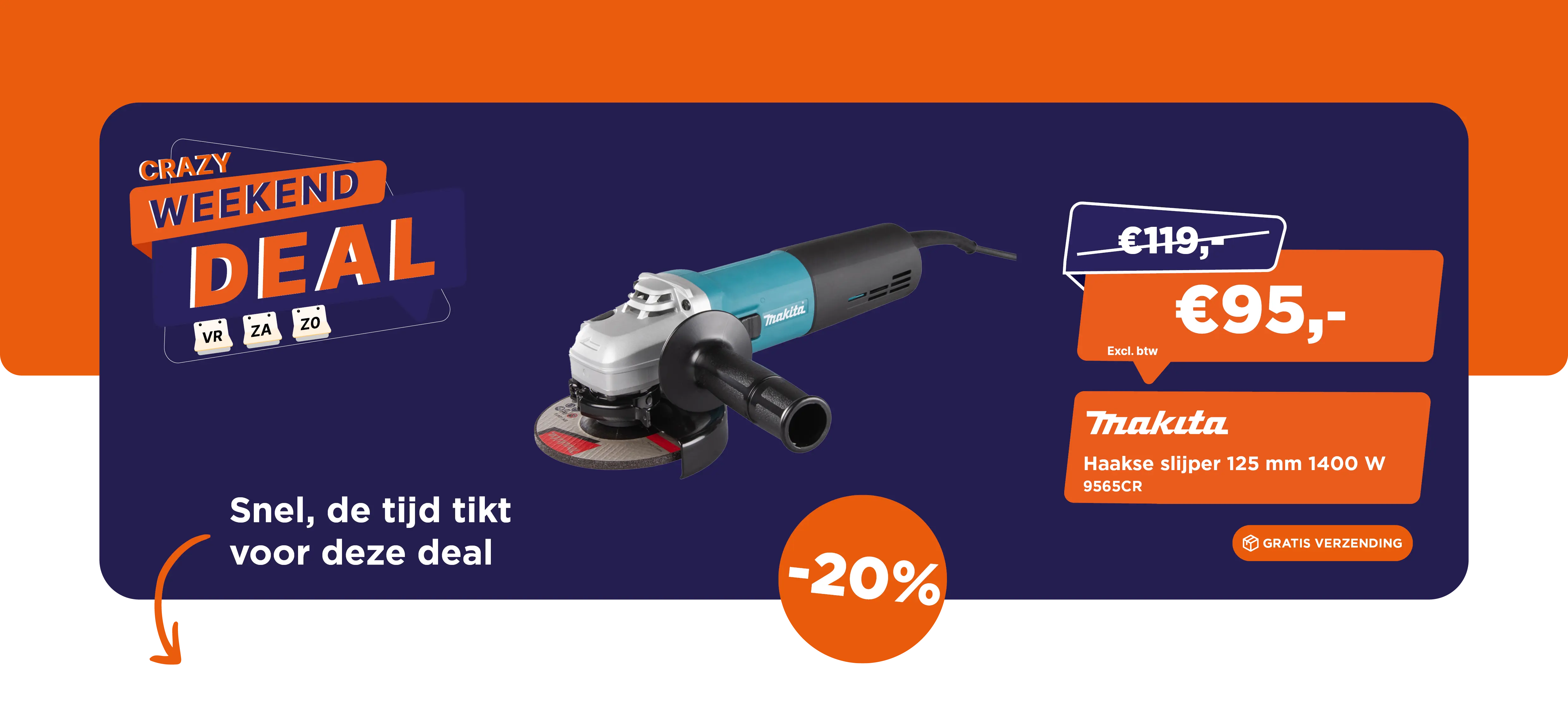 Op de werf telt maar één ding: kunnen vertrouwen op je machine. Met Makita kies je voor doordachte techniek, duurzame kwaliteit en prestaties die blijven doorgaan, ook wanneer het werk zwaarder wordt. Dit Crazy Weekend haal je die betrouwbaarheid in huis aan een scherpe prijs. Mis je kans niet.