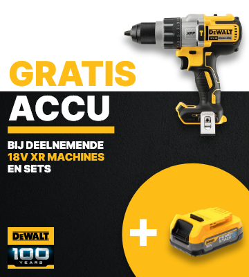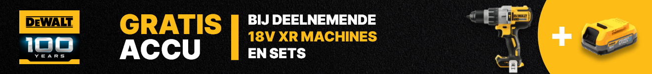- Koop een geselecteerd DeWALT product dat functioneert met een 18V XR batterij in de periode van 1 februari 2024 tot en met 12 mei 2024 op Lecot.shop en ontvang van DeWALT een gratis 5Ah Powerstack accu. Registratie voor de actie bij DeWALT moet uiterlijk 31 mei 2024 voltooid zijn.