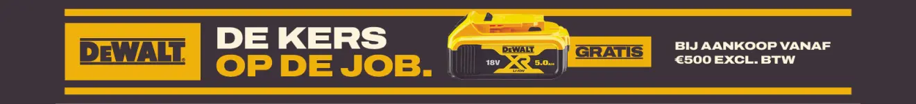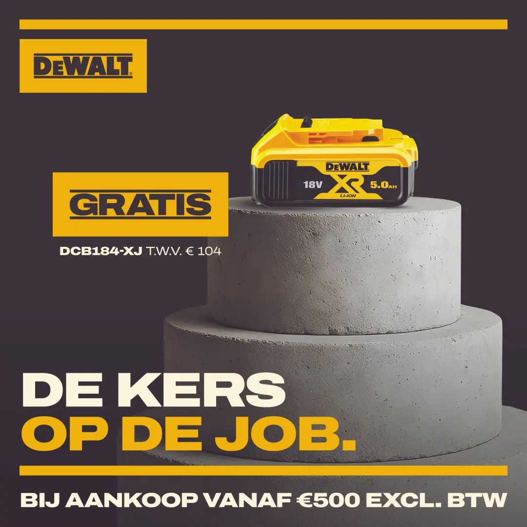 Geef je projecten een boost met DeWALT. Van 4/2/2026 tot en met 31/3/2026 krijg je bij bestellingen vanaf € 500 (excl. btw) een gratis 18V-accu cadeau. Wat je daarvoor moet doen? Niks, wij voegen je batterij automatisch toe aan je bestelling. Jij pakt ze uit samen met je andere DeWALT-producten.