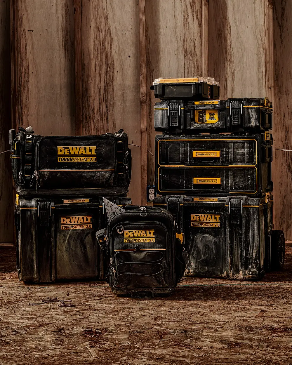DeWALT springt er uit met zijn ToughSystem-opbergsystemen. Deze 4 mm dik versterkte polypropylenen opbergkisten zijn de ideale opbergkoffers voor de vakman. Daar stopt het natuurlijk niet. ToughSystem-opbergkisten zijn stofdicht en bestand tegen waterstralen. Met die IP65-waarde kunnen ze de slechtste weersomstandigheden aan. Op ToughSystem-opbergsystemen zitten metalen sluitingen voor extra duurzaamheid. Om in de meest lastige situaties je gereedschap veilig op te bergen kan je dus rekenen op DeWALT ToughSystem.